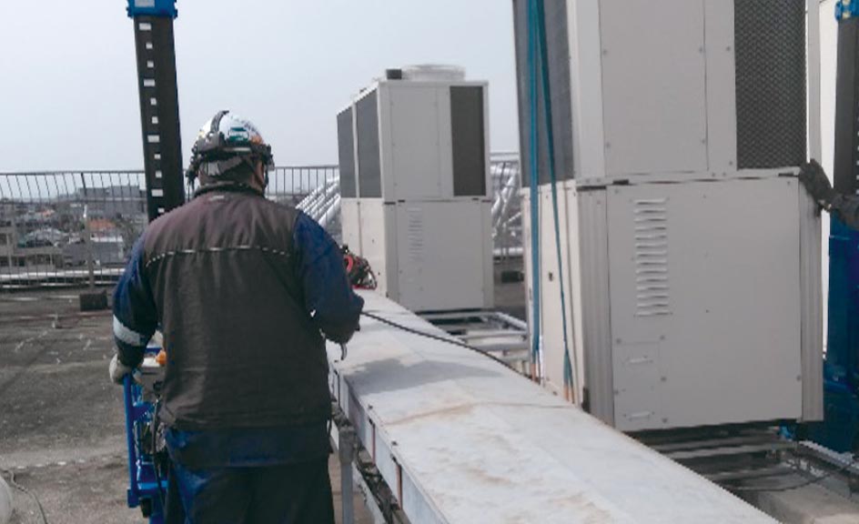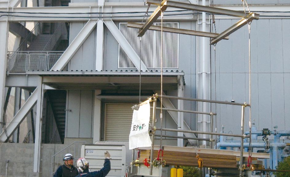 クレーンにて吊り上げ機器の搬出入を行います。 -